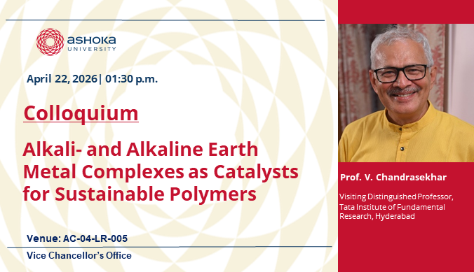 The Vice Chancellor's office invites you to a colloquium on "Alkali- and Alkaline Earth Metal Complexes as Catalysts for Sustainable Polymers" by Prof. V. Chandrasekhar, Visiting Distinguished Professor, TIFR, Hyderabad
