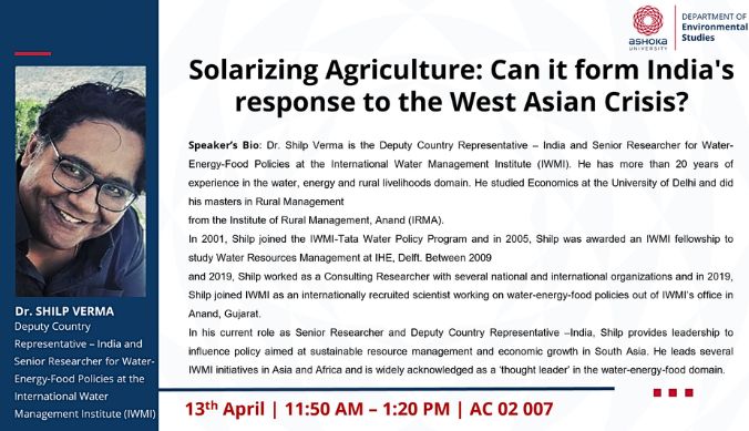 Dear All, The department of Environmental Studies cordially invites you to a guest lecture on 13th April 2026. Title: Solarizing Agriculture: […]